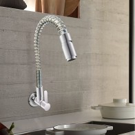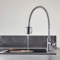 Grifería de cocina al mueble con manguera flexible, ideal para ahorrar espacio y ofrecer mayor versatilidad al dirigir el flujo de agua. Su diseño compacto y funcional se adapta a diferentes estilos, con control de caudal de agua